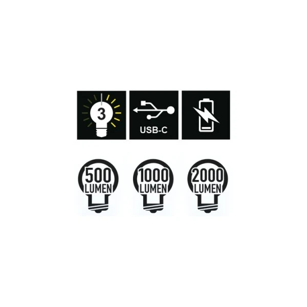 - Drie standen voor lichtsterkte : 500/1000/2000 lumen