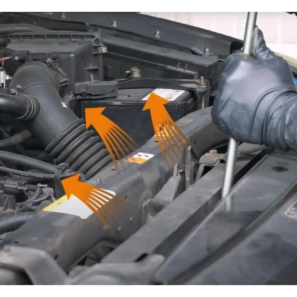 - De 5 gaten die loodrecht op de handgreep staan blazen het vuil van de radiatoren