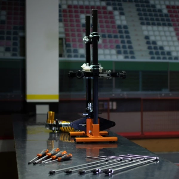 Maakt een volkomen veilige demontage van de achterschokdemper van een motorfiets mogelijk; door de verstellings mogelijkheden toepasbaar bij de meeste achterschokdempers; als alternatief kan het worden gebruikt met de meegeleverde plaat.