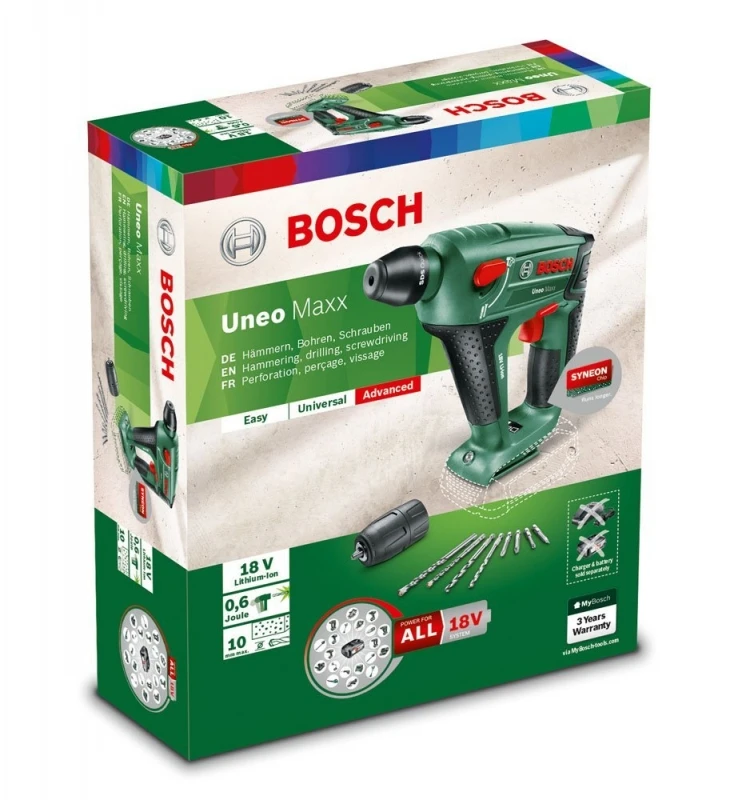 Accuschroevendraaier, boormachine en boorhamer in een enkel apparaat. Dat is de Uneo Maxx van Bosch. Compact, krachtig en ongelooflijk veelzijdig. Met de accuboorhamer hamert, schroeft en boort u in elke ondergrond, of dat nu hout, gips, baksteen of zelfs beton is – alles met een enkele machine! Het innovatieve pneumatische slagmechanisme van de Uneo Maxx maakt het mogelijk. Daarbij voeden de krachtige Lithium-Ion-accu en de intelligente Bosch Syneon-chip de Uneo Maxx met indrukwekkende kracht en meer looptijd per acculading – en u kunt steeds zonder een vervelende kabel werken.