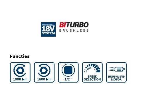 - De beste prestaties voor zware klussen met een aanhaalmoment van 1000 Nm en een losbreekmoment van max. 1600 Nm
