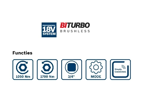 - BITURBO Brushless-technologie met een krachtig aanhaal- en losbreekmoment van 1050 Nm en 1700 Nm