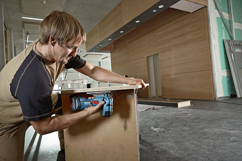 Deze machine is ideaal voor het zagen van bochten en recht zagen in massief hout, spaanplaat en samengestelde houtmaterialen evenals voor dikkere of hardere materialen. Deze is compatibel met het Bosch Click & Clean stofafzuigsysteem en andere Bosch stofzuigers evenals met alle Bosch Professional 18V-accu’s en opladers (Professional 18V System) en geleiderails via adapter.