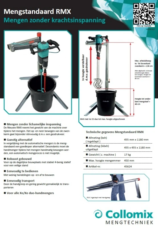 Met de mengstandaard RMX voert de gebruiker de handmenger met het grootste gemak door het materiaal. Het belastend vasthouden van de machine vervalt. Ideaal voor het mengen van zware, taaie materialen en bij langdurige meng opgaven.