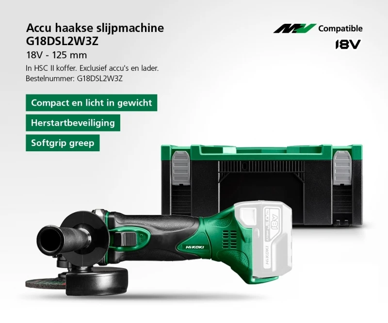 HiKOKI G18DSL2W3Z Haakse slijpmachine | 125 mm | 18 Volt | Basic | +Systainer