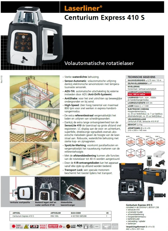 Professionele rotatielaser met groene laser. Deze laser heeft een bereik van 400 meter. De Centurium Express 410 S Green is te gebruiken als punt-, scan- en rotatie laser.