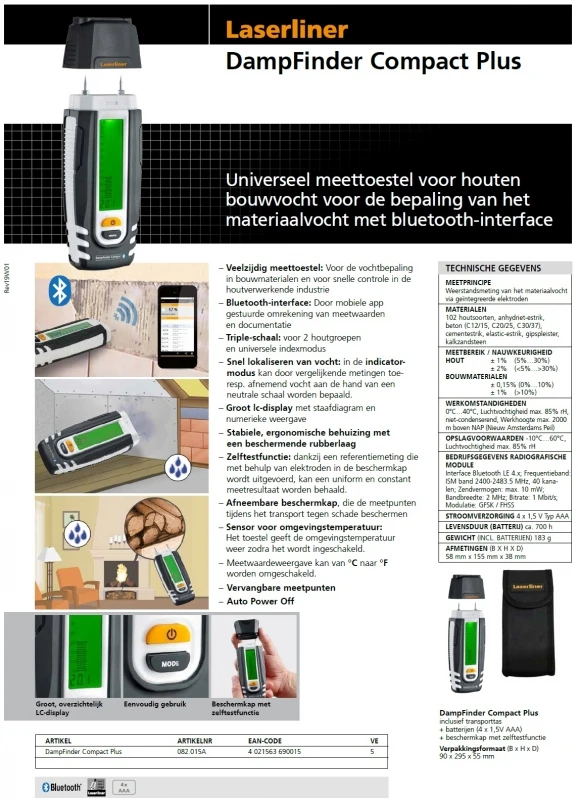 Laserliner DampFinder Compact Plus Vochtmeettoestel | Universeel | Hout- en bouwvocht | Bluetooth
