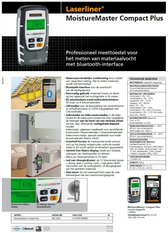 - Productuitvoering zoals MoistureMaster Compact maar met Bluetooth-interface voor de overdracht van de meetgegevens – CM-modus voor de beoordeling van anhydriet-estrik, en cementestrik (vergelijkbaar met CM-methode)