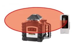 Met de afstandsbediening kunnen alle functies van de rotatielaser tot 40 meter worden aangestuurd. Door de 4 IR-ontvangstdioden kan het apparaat vanaf elke zijde op afstand worden bediend. De Reikwijdte van de laserontvanger bedraagt tot 400 m radius.