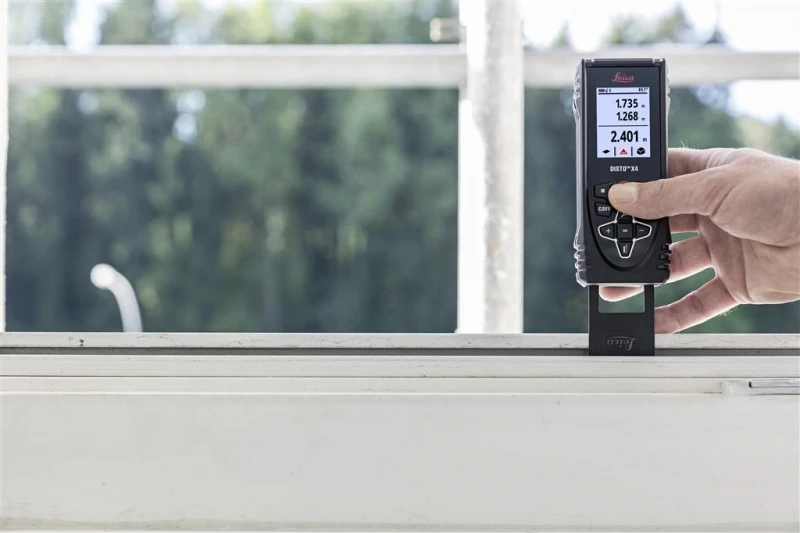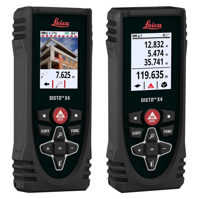 De Leica Disto X4 laserafstandsmeter is met recht de meest innovatieve afstandsmeter ter wereld. Naast de nauwkeurigheid van ca. 1 mm, een bereik van 150 m en Bluetooth Smart beschikt de X4 over een roterend scherm waardoor zij onder alle omstandigheden goed afleesbaar is. Met de ingebouwde camera verricht u zonder problemen metingen buitenshuis. De X4 is zelfs uit te breiden met een speciale adapter waarmee u het toestel in een handomdraai veranderd in een 3D inmeetstation zoals de Disto S910.