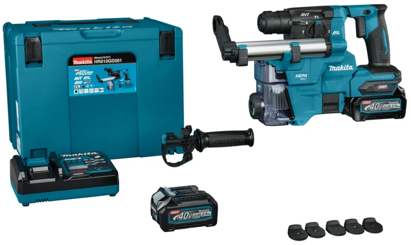 XGT 40 V Max Accu combihamer HR010GD201 met SDS-PLUS opname. Geleverd met 2x 2,5 Ah accu , snellader en stofafzuiging in Makita M-Box.