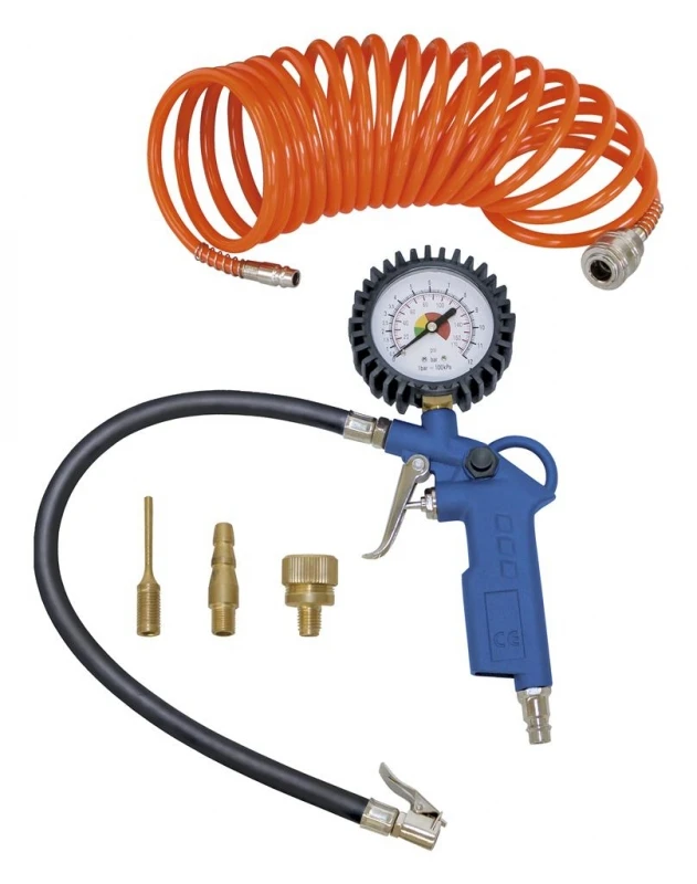 - Bandenpomp, met rubberen manometer beschermer, dubbele schaal (bar/psi) manometer en een deflatieknop