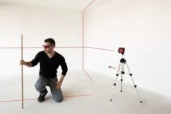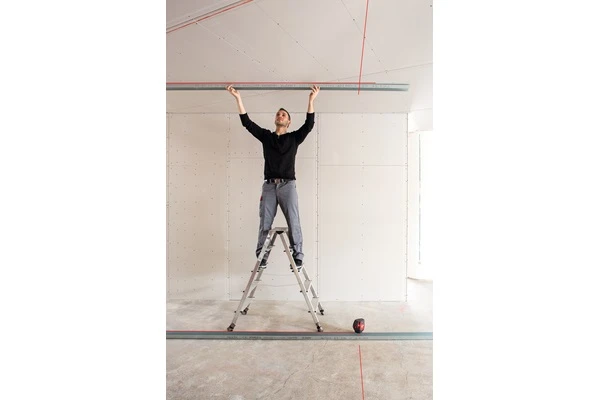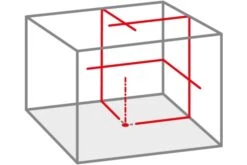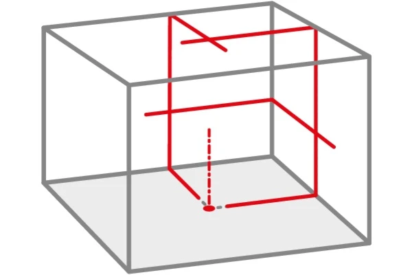 De QUBO projecteert twee verticale laserlijnen in een exacte hoek van 90 gr op elkaar die op hun snijpunt een kruis vormen op het plafond. Dankzij de intelligente constructie beginnen de lijnen al op de vloer, direct