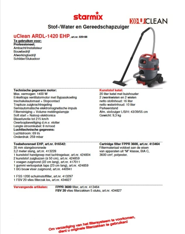 Technische gegevens van Starmix NSG uClean ARDL-1420 EHP
